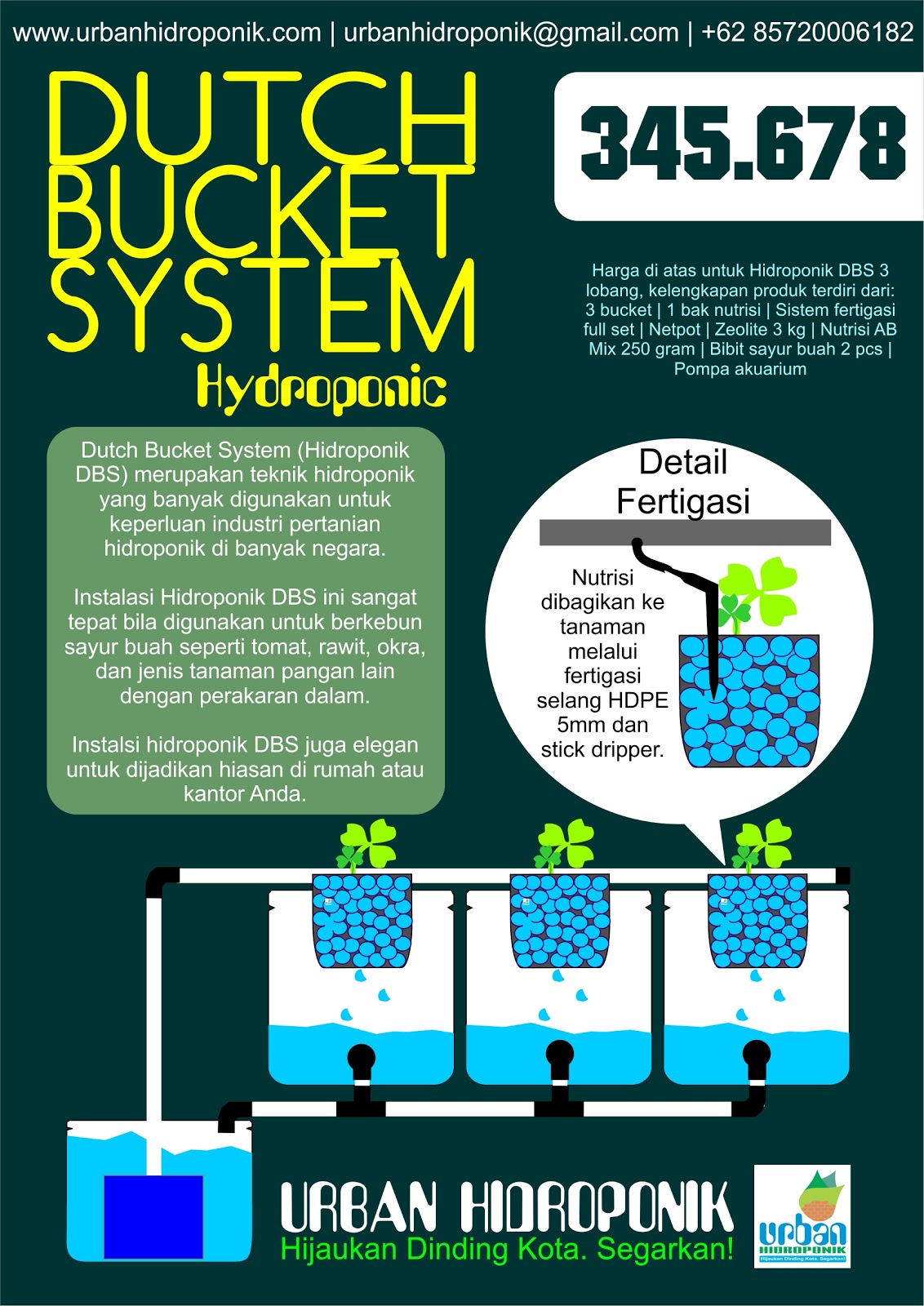 Bahannya bisa menggunakan limbah tas ransel bekas. Dalam menggunakan teknik fertigasi biaya untuk pemupukan dapat dikurangi karena pupuk diberikan bersamaan dengan penyiraman. Karena sistem ini menggunakan drip irrigation atau irigasi tetes dimana tanaman akan disiram dengan cara meneteskan air.